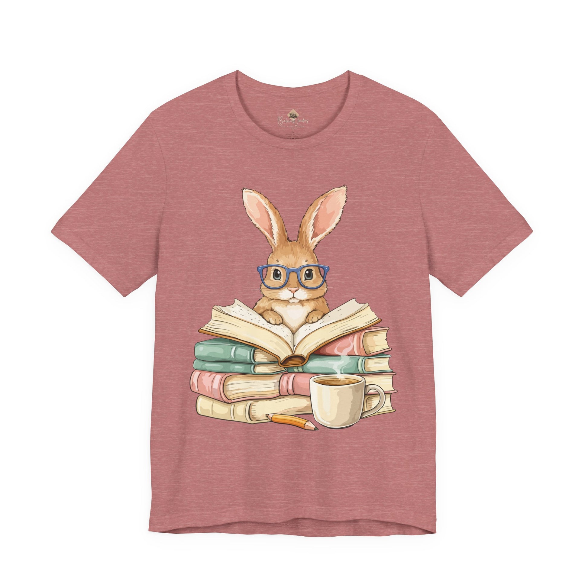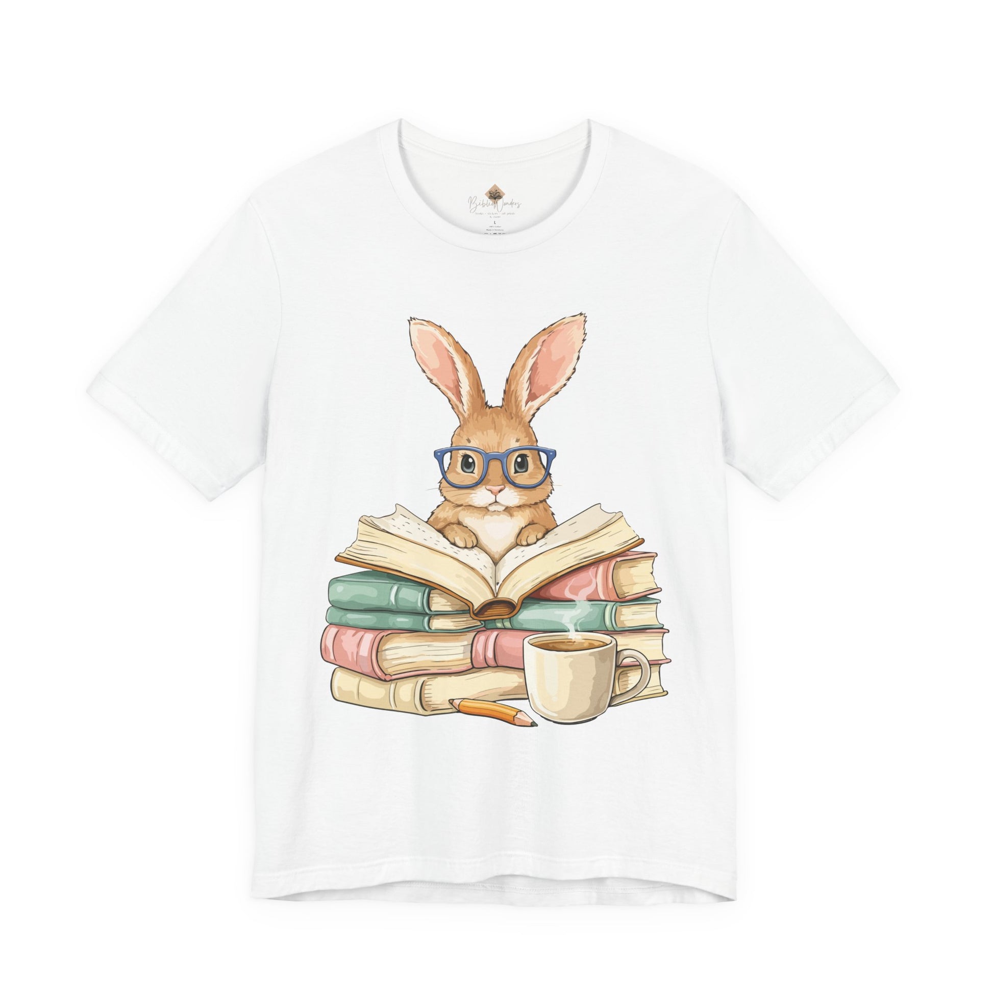 Reading Rabbit T‑Shirt — Cute Bunny with Books & Coffee Graphic Tee